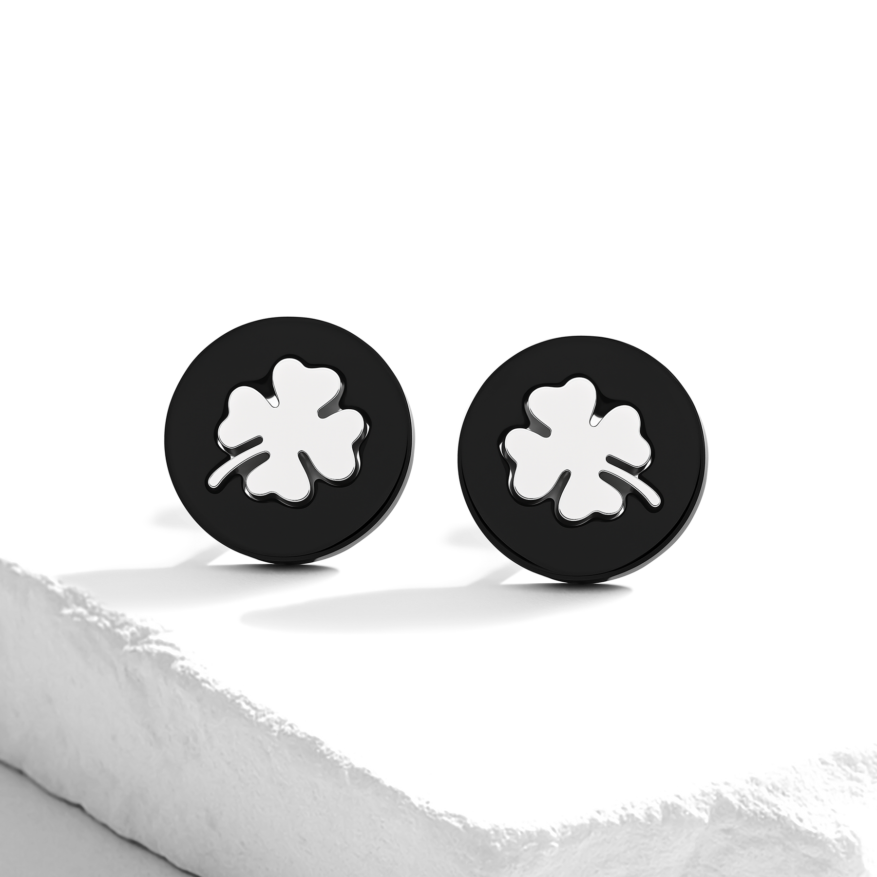 Elegantes aretes para mujer de acero inoxidable de calidad 316L plateado en baño de oro blanco, lo que garantiza una alta durabilidad y un acabado brillante pulida a mano, con sellado e-coating para una mejor protección del color. Es una pieza circular y plana de color negro y en el centro lleva un trébol de cuatro hojas. Es un collar con un estilo contemporáneo y audaz. El trébol de cuatro hojas añade un símbolo de buena suerte y fortuna, haciendo de esta una pieza con significado.