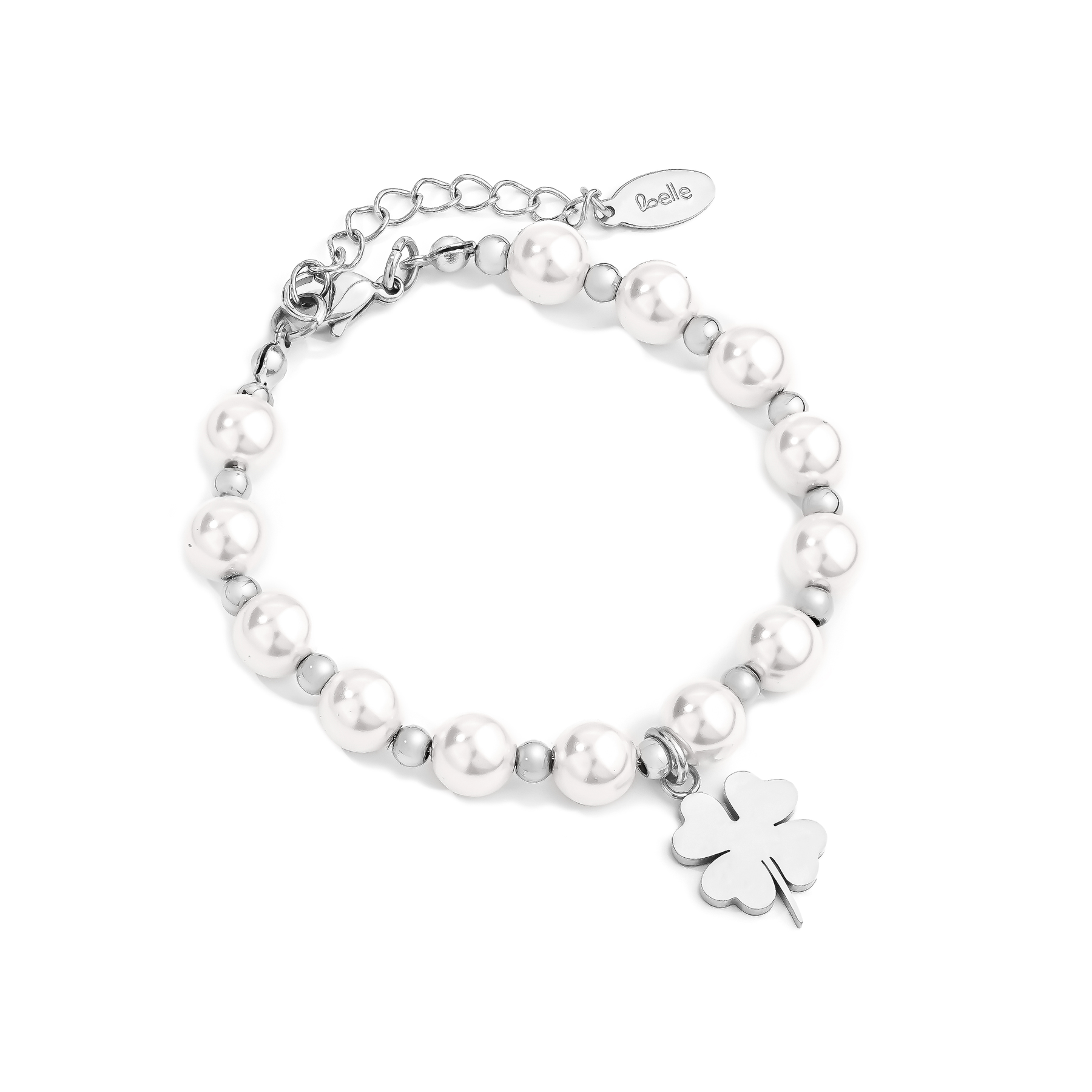 Elegante pulsera de acero inoxidable de calidad 316L con baño en oro de 18 quilates pulida a mano, con sellado e-coating para una mejor protección del color. Cuenta con un dije de trébol y perlas blancas con bolitas de acero color dorado, diseñados con un estilo minimalista y delicado que realza cualquier look. Ideales para mujeres que buscan una joya versátil, duradera y con un toque moderno.