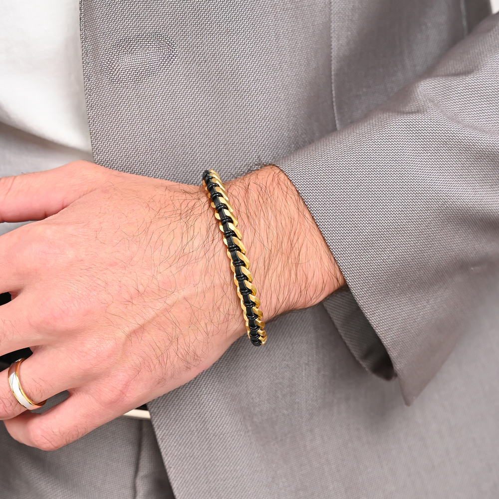 Pulsera de acero inoxidable de calidad 316L , con sellado e-coating para una mejor protección del color pulida a mano. Su diseño de cadena es tipo eslabon forzada hueca con bio cuero negro entrelazado. Este accesorio minimalista, con un diseño simbólico y elegante, es perfecto para el día a día o para complementar looks más formales.