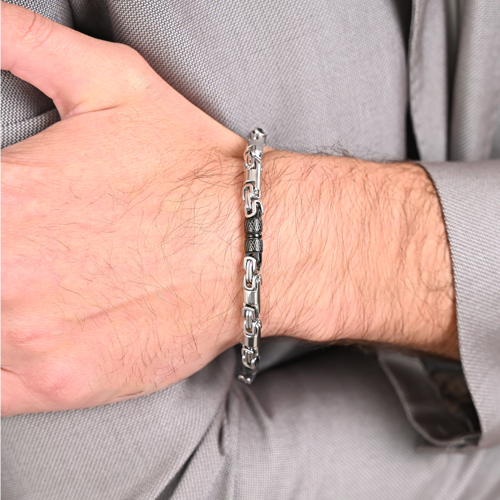 Pulsera de acero inoxidable de calidad 316L, con sellado e-coating para una mejor protección del color pulida a mano. Su diseño de cadena es tipo eslabones grueso plateado. Los eslabones tienen una forma rectangular o de barril con bordes suaves, lo que le da una apariencia sólida y contemporánea. Este accesorio minimalista, con un diseño simbólico y elegante, es perfecto para el día a día o para complementar looks más formales.