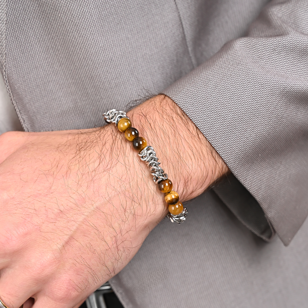 Pulsera de acero inoxidable de calidad 316L, con sellado e-coating para una mejor protección del color pulida a mano. Su diseño cuenta con la piedra Ojo de tigre que brinda fuerza, protección y estabilidad emocional. Este accesorio minimalista, con un diseño simbólico y elegante, es perfecto para el día a día o para complementar looks más formales.
