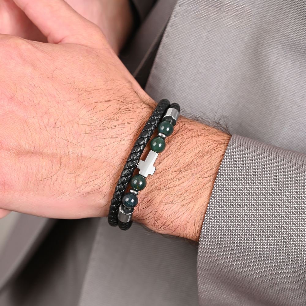 Pulsera de acero inoxidable de calidad 316L, con sellado e-coating para una mejor protección del color pulida a mano. Presenta un diseño contemporáneo y espiritual, combinando elementos naturales y metálicos en una composición de doble capa. El materia de bio cuero y piedras que representa estabilidad, escudo contra energías negativas y manteniéndote centrado y seguro. Este accesorio minimalista, con un diseño simbólico y elegante, es perfecto para el día a día o para complementar looks más formales.