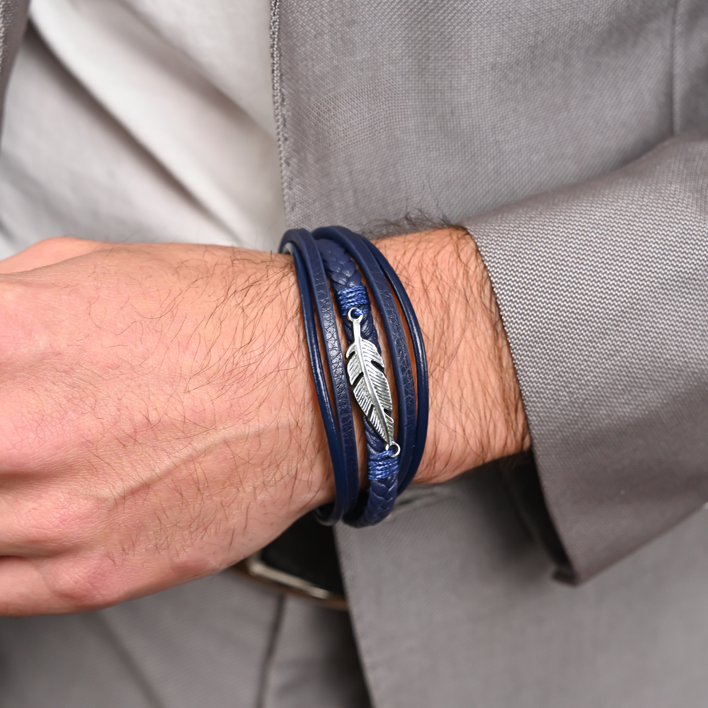 Pulsera de acero inoxidable de calidad 316L, con sellado e-coating para una mejor protección del color pulida a mano. Presenta un diseño de múltiples capas con una estética bohemia y natural, centrada en tonos oscuros y un distintivo elemento metálico. Tiene un diseño de dos correas distintas: bio cuero liso y bio cuero trenzado. El elemento central y distintivo de la pulsera es un dije en forma de pluma de color plateado. El cierre de la pulsera es un broche de presión. Este accesorio minimalista, con un diseño simbólico y elegante, es perfecto para el día a día o para complementar looks más formales.