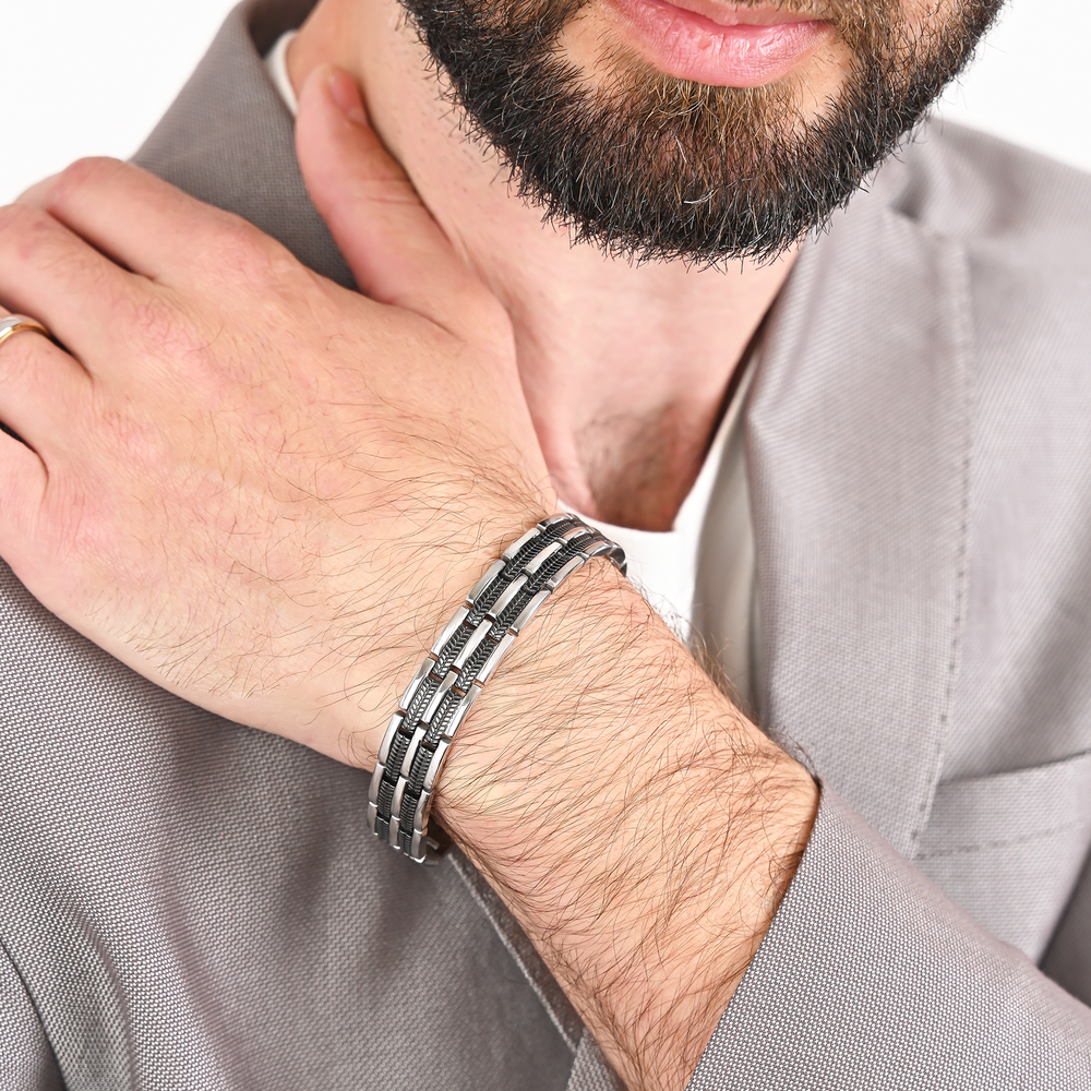 Pulsera de acero inoxidable de calidad 316L, con sellado e-coating para una mejor protección del color pulida a mano. Presenta un diseño de eslabones de metal de color plateado, con un acabado pulido o satinado. En el centro de cada sección principal de los eslabones metálicos, se encuentran dos bandas paralelas de material trenzado de color negro. Esta pulsera tiene imanes integrados que pueden ayudarte a mejorar la circulación, reducir el dolor y aumentar tu energía. Este accesorio minimalista, con un diseño simbólico y elegante, es perfecto para el día a día o para complementar looks más formales.