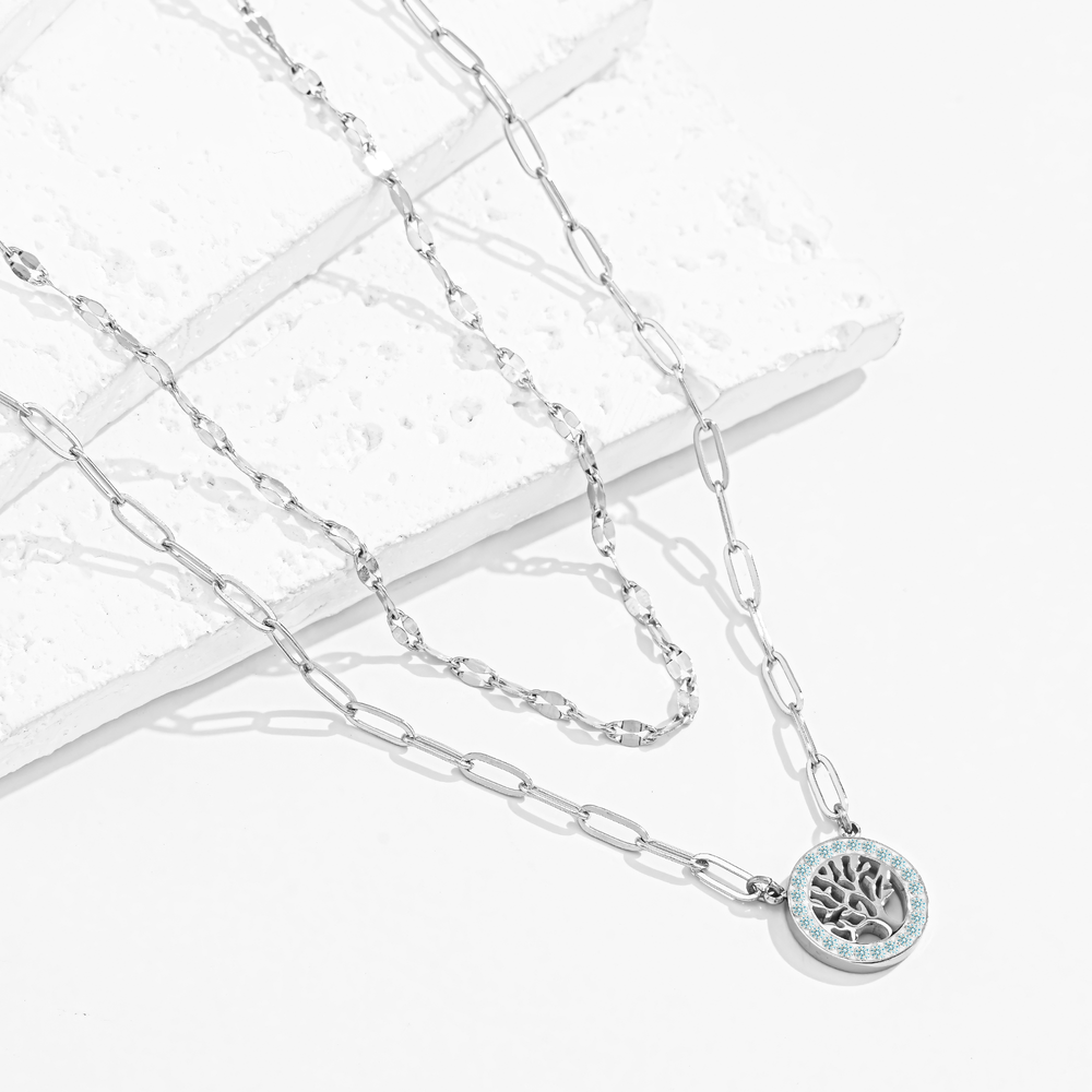 Elegante collar de acero inoxidable de calidad 316L con baño en oro de 18 quilates pulida a mano, con sellado e-coating para una mejor protección del color. Cuenta con un diseño de doble cadena con un dije circular con un diseño de árbol de la vida con cristales blancos al contorno, diseñados con un estilo minimalista y delicado que realza cualquier look. Ideales para mujeres que buscan una joya versátil, duradera y con un toque moderno.