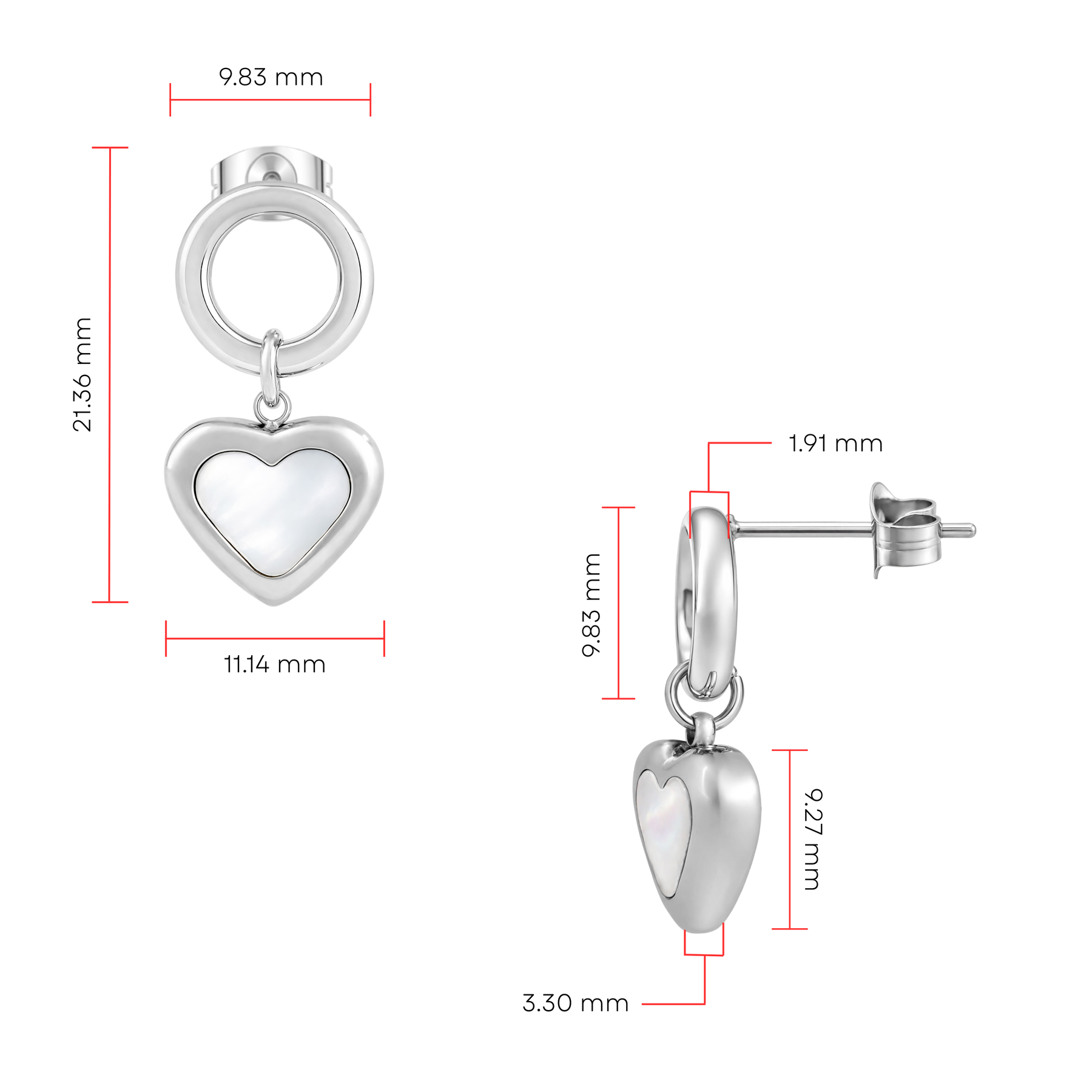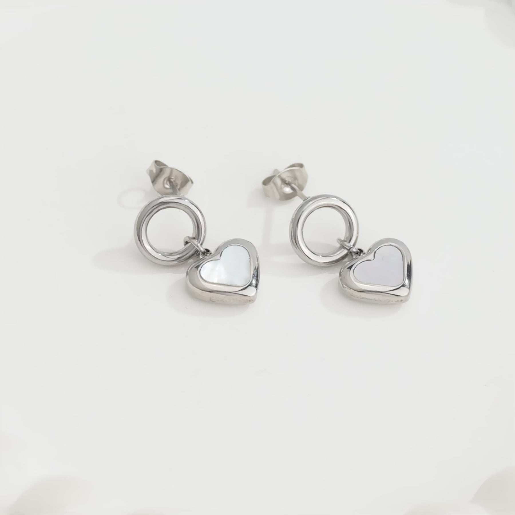 Elegantes aretes de acero inoxidable de calidad 316L pulida a mano, con sellado e-coating para una mejor protección del color. Cuenta con un estilo contemporáneo y romántico. El diseño juega con la combinación de un círculo perfecto en la parte superior y un corazón estilizado en la parte inferior, creando un equilibrio visual simétrico y fluido.
