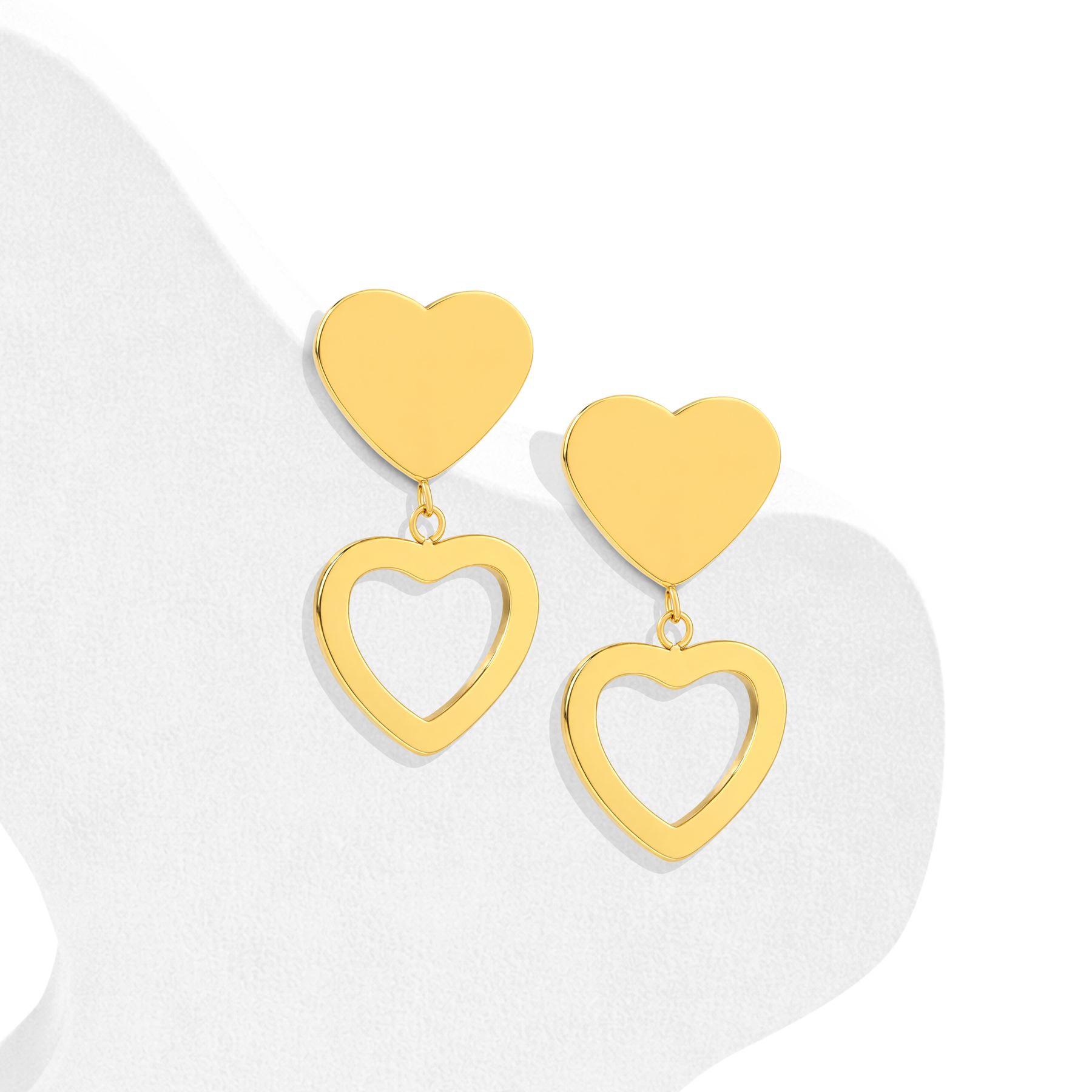 Elegantes aretes de acero inoxidable de calidad 316L en baño de oro de 18 quilates pulida a mano, con sellado electrónico para una mejor protección del color. Cuenta con un estilo romántico y moderno. Cada arete está compuesto por dos piezas en forma de corazón. El superior es un corazón sólido y liso que funciona como base y el inferior es un corazón calado que cuelga delicadamente, aportando movimiento a la pieza. Cuentan con un pulido de alta calidad que refleja la luz intensamente, dándoles un aspecto lujoso y sofisticado en tono dorado.