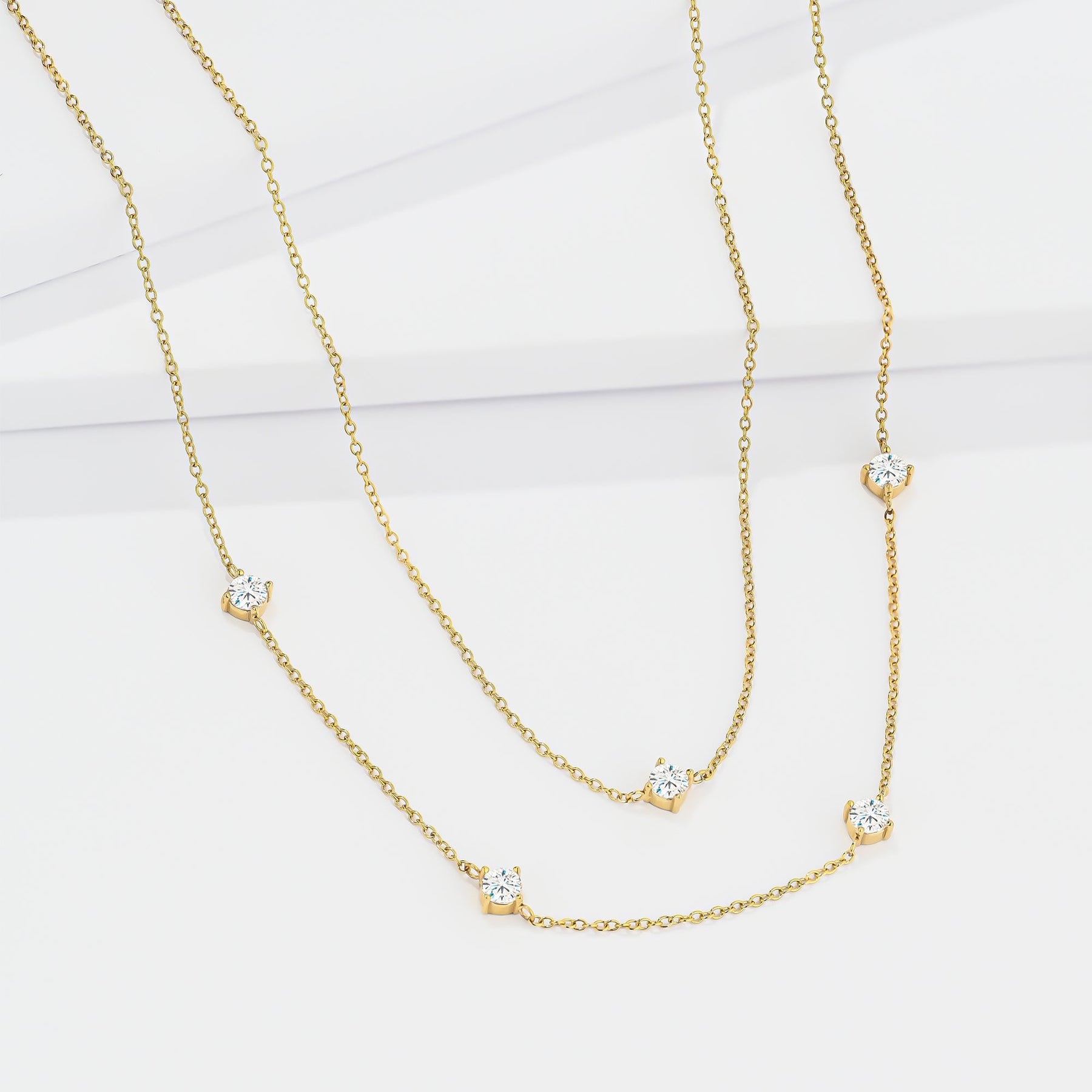 Elegante collar de acero inoxidable de calidad 316L con doble baño en oro de 18 quilates pulida a mano, con sellado e-coating para una mejor protección del color. Cuenta con un diseño de dos capas con cristales pequeño blancos, diseñados con un estilo minimalista y delicado que realza cualquier look. Ideales para mujeres que buscan una joya versátil, duradera y con un toque moderno.